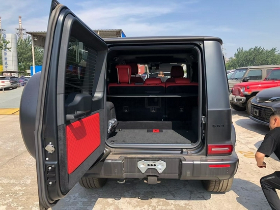 2021款奔驰G63时光铭刻版,全新的AMG前端设计,带有镀铬垂直格栅条的散热饰板打造出别具一格的前脸造型。AMG 车身风格组件等装备的点缀进一步提升了质感,让车辆前端更富表现力。包括高光黑色车轮、颜色稍暗的照明系统、喷涂曜岩黑色漆的精选附加部件以及深色后车窗,令车辆更具个性气质。