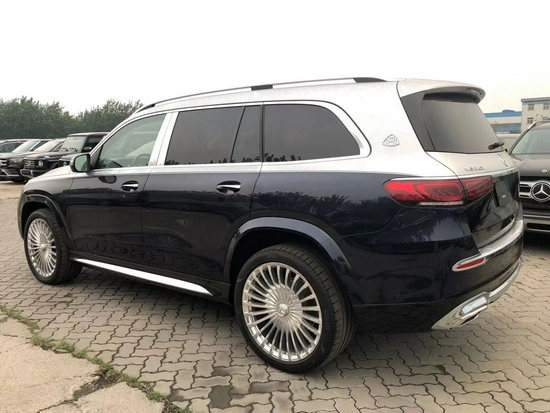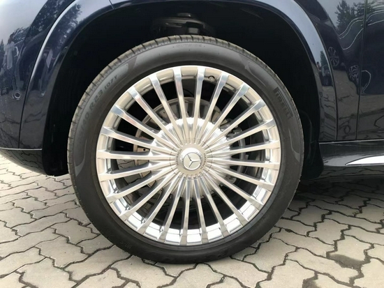 车身的侧面是巨大的23寸轮子,前面是285宽,后面是325宽。前后门都是电吸门,而且你打开这个车门的时候,它的电动迎宾踏板会自动出来,后面是迈巴赫原厂的标识。车尾也有一个迈巴赫的标志,右边有一个GLS600的标志,并且整个车尾有三条电镀条,来把这个车看起来更加的立体。排气方面也是使用跟进气相呼应的一个造型设计,以前的奔驰600都是12缸,现在的600就是数大。