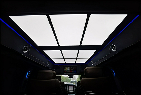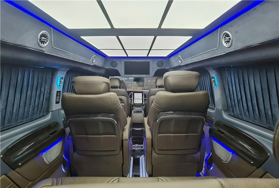 2021款奔驰威霆商务车车身内壁采用进口麂皮绒和珍贵实木装饰面板包覆,豪华宫格顶灯带来奢华氛围,前后车舱采用了半灵活的多功能中隔断设计,固定的吧台加可升降的大尺寸电视,殿堂BOSE音响和蓝光DVD,满足一切娱乐生活需求。