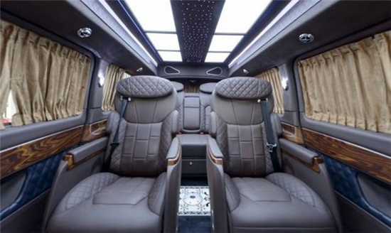 奔驰V250改装商务车房车价格内部装饰充满法国式的浪漫,九宫格灯珠镶嵌的椭圆形豪华顶棚造型设计气势磅礴,沿车身走向,两端与驾驶室隔屏和后门相衔接,形成古典对称的流线型图案。