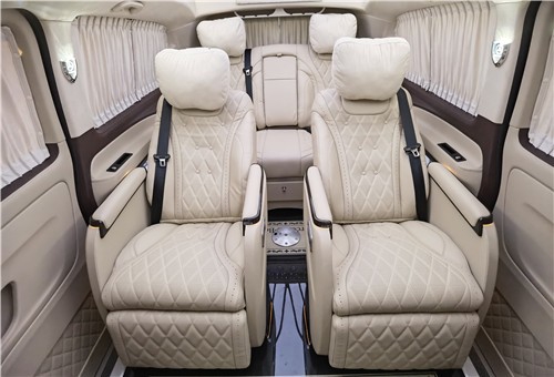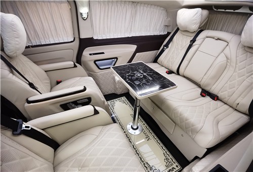 奔驰威霆商务车改装后的乘坐舱更加舒适,换上了高级商务航空座椅。该车采用七座不仅仅,在第二、三排格局合理舒适,第二排为航空级首长席座椅,带电动按摩、旋转、通风、加热等八项舒适性调节功能。第三排可以根据需要放平就是一张舒适的双人床。