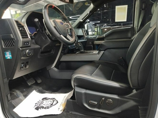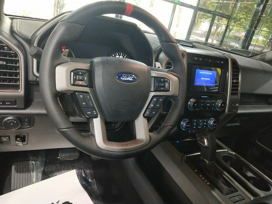 进口福特猛禽F150车内配备标准独特的皮革和布艺装饰的座椅,驾驶员侧的电动十向调节。这些座椅同时具备记忆功能。中央控制区搭配了触控式显示屏,其下方则是多媒体控制区及空调面板,采用旋钮物理按键的组合。中控功能区域可分为三个小控制区,最上端为音响控制及导航控制,中间为收音机调节控制,最低端为空调及座椅加热控制。