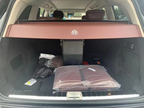 尾部设计以C柱上的迈巴赫Logo最为醒目和出彩,高级感爆棚。后备箱中间一大块突出的立方体其实是车载冰箱,占用了一些空间。不过没关系,冰箱外壳的两侧可以竖着轻松塞进四个大号行李箱,毕竟奔驰GLS (配置|询价)本身是7座车,在变身迈巴赫后去掉了第三排座椅,所以尾部空间非常可观。