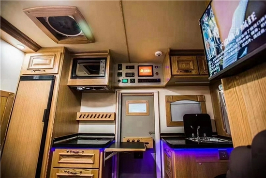 由乘客门隔开,不同的功能相互呼应的同时也让做饭井然有序,橱柜推拉式抽屉便于存放日常生活用品及碗具。其它方面配备触摸式集中控制系统+机械式翘板开关、液晶电视、小米盒子、日本YAMAHA八喇叭音响系统、抽油烟机、微波炉、西门子电磁炉、152L赛特福德房车专用冰箱、大宇3kg洗衣机、特鲁马燃油暖风热水一体机、四路监控、一氧化碳/烟雾报警器等。室内多个220V、12V电源插座及USB充电接口可满足日常充电需求。