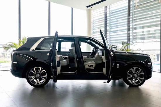 劳斯莱斯库里南标志性的对开式车门设计,两扇车门均可开启乎90度,以便车内成员方便上下车,配合大尺寸的天窗,让车内乘客感觉更加舒适。从侧面车头处看,库里南与家族旗舰幻影 (配置|询价)如出一辙,作为车主来说,这是一件值得去炫耀的事情。开门时车身会自动下降40mm,方便乘客上下车,启动后车身则会自动升高。