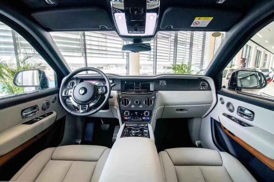 劳斯莱斯库里南内饰延续了全新幻影的设计风格,整体用料依旧一如既往的奢华高贵,中控采用大面积实木打造,配合方向盘上的实木点缀,既复古又豪华。中控屏幕尺寸为10.2英寸的屏幕,轻触车门把手上按键就可以电动关闭,后排控制台与前部是断开的,在狭窄环境停车后排乘客可以选择任意一侧下车。