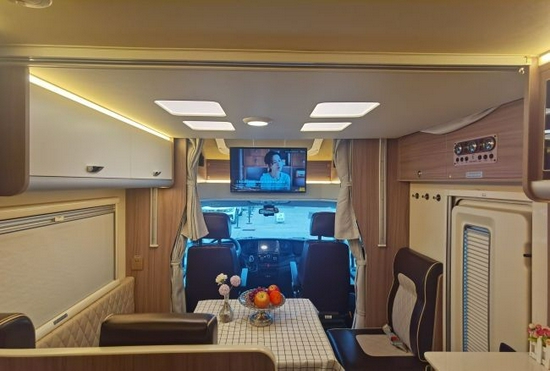 国六依维柯欧盛自动挡T型小额头房车车内驾驶舱后面的是乘客区,采用的是常见的L型卡座沙发设计+一张可移动升降式餐桌,沙发采用环保皮革包覆,乘坐感非常额舒适,配合可旋转的副驾驶座椅,可以同时容纳多人就餐、品茶聊天。另外餐桌降下时可拼成一张尺寸为2200×1500mm的沙发床,满足临时休息是没有问题的。