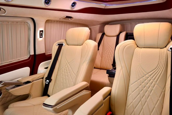 来到驾驶室可以看到黑红交叉的皮革座椅,在门板扶手,中控台都是加了碳纤维,带给您满满的豪华运动风,多功能方向盘做了皮革包覆,中控台包括A柱和全车的顶部都是翻毛皮的处理;V260悬浮式的中控更加容易操控,正副驾驶座椅带通风加热电动调节功能,让您乘坐舒适感更佳;车载小冰箱满足您的日产需求。