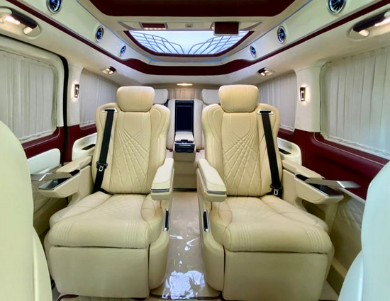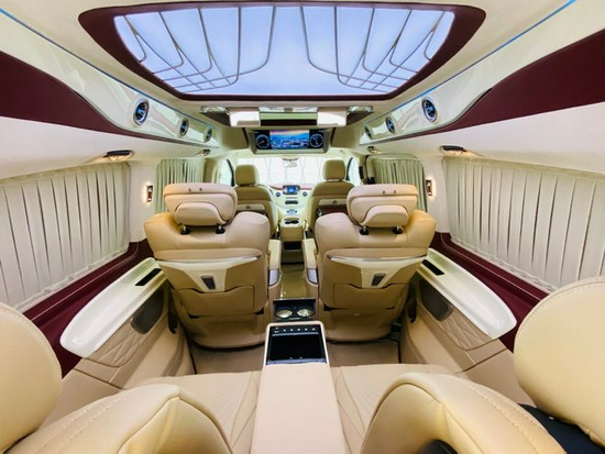 奔驰威霆迈巴赫银河碳纤维定制版,采用双侧电动门,上门处的迎宾踏板和顶部的麂皮绒星空顶印有银河发光Logo,迎接尊贵的您,后排两个独立宽大的航空头等舱座椅,通风加热按摩,座椅记忆,8向电动调节,带给您极致的舒适感受,