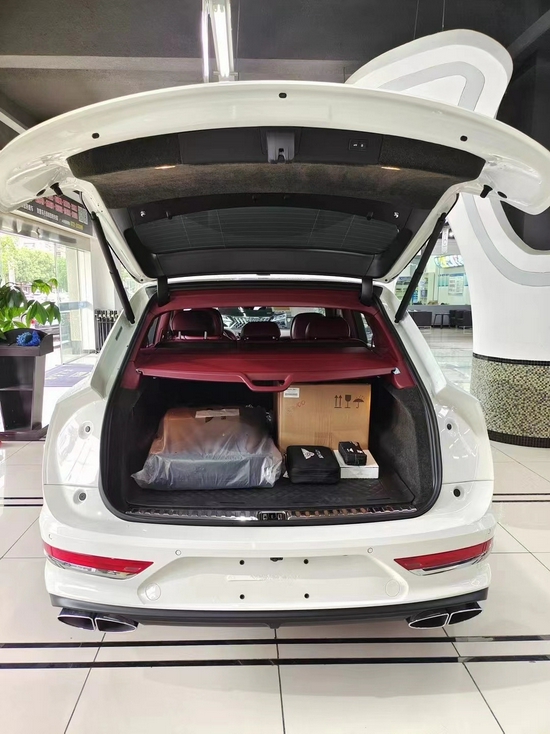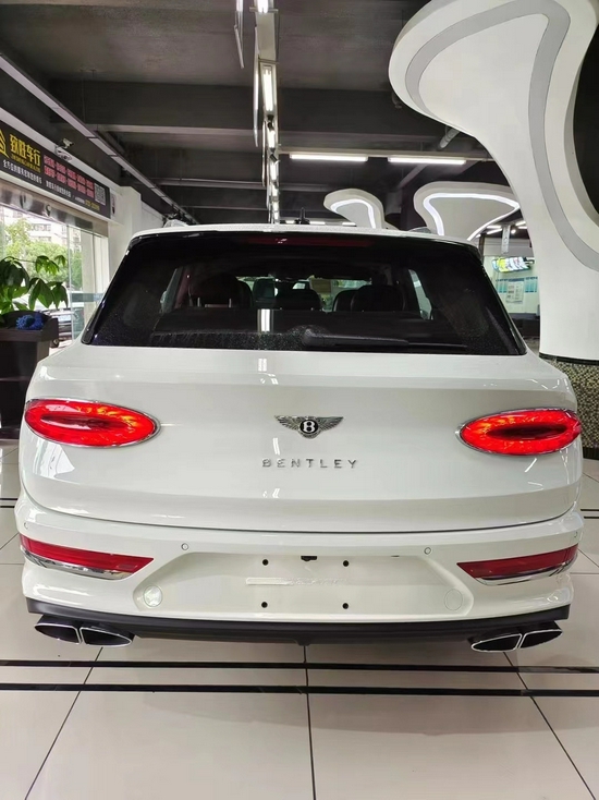 2021款宾利添越为了确保车主打开后备箱尾门取物的安全性,当尾门打开后,置于后保险杠上的示廓灯就会及时亮起,起到警示后方车辆的作用。牌照位置则下移到保险杠上,让上方的“Bentley”字样更加醒目。而更加宽大的椭圆形分体式排气管的造型与尾灯也是上下呼应。