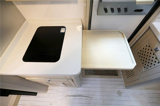 厨房区实木组合式橱柜采用分区域布局设计,由乘客门隔开,不同的功能相互呼应的同时也让做饭井然有序,橱柜推拉式抽屉便于存放日常生活用品及碗具。其它方面配备触摸式集中控制系统+机械式翘板开关、液晶电视、小米盒子、日本YAMAHA八喇叭音响系统、抽油烟机、微波炉、西门子电磁炉、152L赛特福德房车专用冰箱、大宇3kg洗衣机、特鲁马燃油暖风热水一体机、四路监控、一氧化碳/烟雾报警器等。室内多个220V、12V电源插座及USB充电接口可满足日常充电需求。