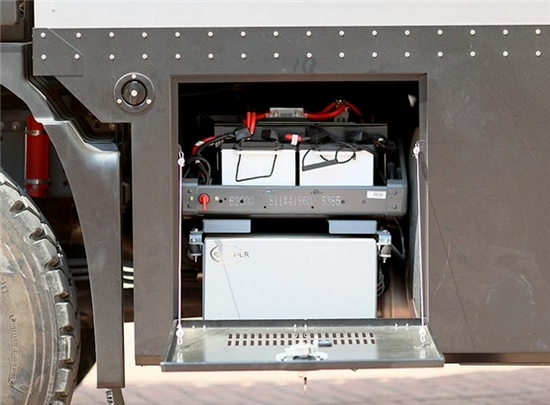 车身四周外市电系统功能齐全,其它方面包括进口CAMPO房车专用3.5米电动遮阳棚、重力注水口、外置淋浴器、韦度4kW发电机、900W单晶高效太阳能板、1600Ah磷酸铁锂电池(含充电机)、德国纽福克斯3000W+3000W逆变器(防辐射处理)等。标配前12000磅+后20000磅的绞盘,对于野外自身脱困能力起到了很好的效果,另外在车队行进途中还可以帮助其它同行的车友,提高相互配合默契度的同时也彰显自身优秀的越野能力。