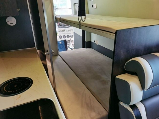 再往后是整车的睡卧区,采用纵置子母床的设计,上床的尺寸为1950*780(mm),下床的尺寸为1950*830(mm),可拓展成1950*1250(mm),上下床铺间距为750mm