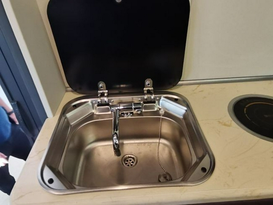 厨房区位于会客区的对面,白色的厨房豪华理石台面上配备有带盖水池、折叠水龙头以及一个电磁炉,灶台的旁侧配备有电源接口,宽裕的台面上可以放置一些常用的烹饪电器辅助做饭