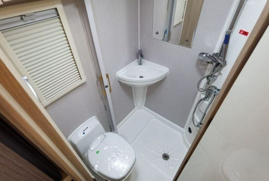 为什么说这是一款更适合2人旅行的房车,从上面2张车内生活区的全景图可以看出,全车只有车尾床1张固定床位,相比C型房车的额头床,它不需要爬上爬下,对于老两口来说更加友好。同时该车布局还有一个亮点就是分区卫生间的设计,如厕和淋浴互不影响。