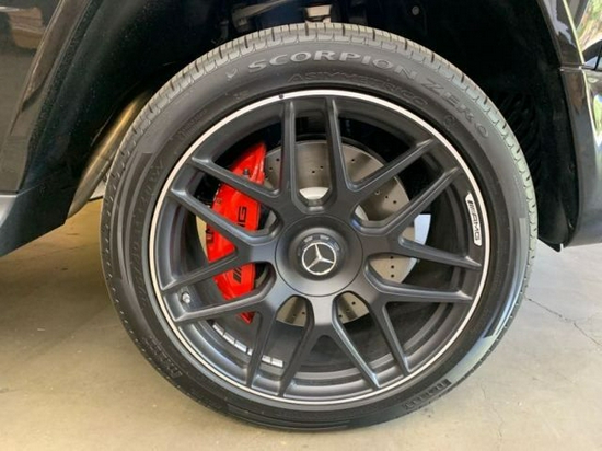 车身侧面,关于G级方正的车身造型已无需赘言,新款G63升级了车身材料后,拥有更轻的体重,以及更为刚强的身体。翼子板上的V8铭牌巳成为一种炫耀,两侧共四出的排管更是丝毫不低调。大轮毂一看就不好惹,轮胎采用了固特异 EAGLE F1系列,尺寸为:295/40 R22。