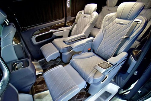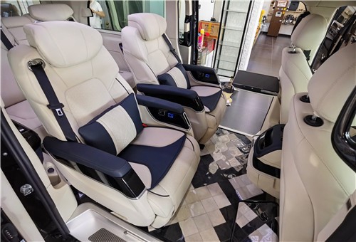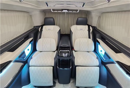 2021款奔驰V260L改装商务车第二排航空座椅为带电动、加热、按摩、通风功能的航空级首长席,可沿着地面上滑轨实现一键电动式前后滑动,对于这种智能化的乘坐体验,是原厂车型笨拙的手动拖拽模式所望尘莫及的。车内的氛围灯打开后,奔驰V260内舱变得灵活多变,气氛也可以根据主灯颜色变换而变化,主要的乘坐座椅配置的独立的按摩功能,通风加热,一体腿托,功能丰富,乘坐舒适,是商务接待用车的代步良品.