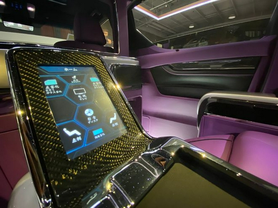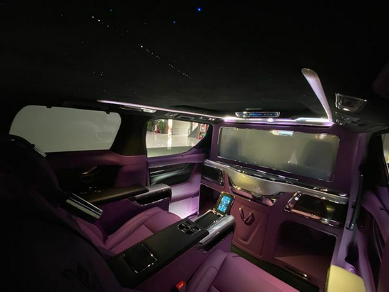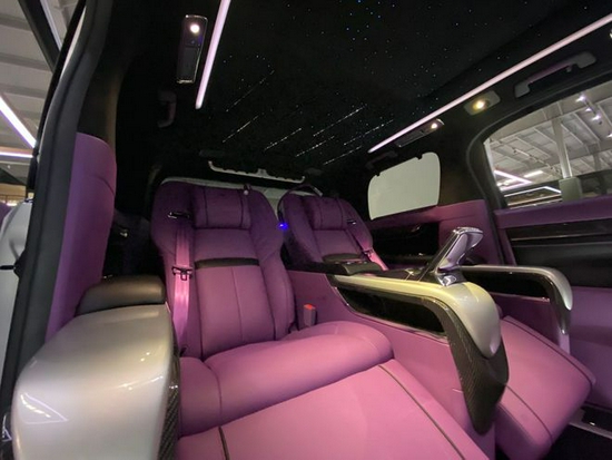 进口酸枝科技木和金丝楠木拼接铝木地板,质感卓越纹理鲜明。幻影同款星空顶在意大利阿尔坎塔拉麂皮绒定的衬托下,放入坠入银河之中一般,享受这浩瀚的繁星围绕于身侧的无限魅力。后舱采用原装进口一键式电动折叠航空首长席,加热、通风、电动按摩功能加持,给身体无尽的可能性,享受无与伦比的放松与自在。一键式超静音高清液晶升降电视搭配JBL立体式音响系统,享受来自于原始的视听盛宴,开启最曼妙的驾驶之旅。
