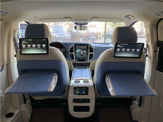 奔驰威霆改装七座商务车整车的色调黑灰为主,非常符合商务风的配色,内舱用了大量的阿尔坎塔拉麂皮绒包覆,质感非常舒适。奔驰威霆改装七座商务车大屏吸顶电视配合两侧的Bose音响,为车内提供一个较为优渥的视听娱乐场所。驾驶舱座椅背后的折叠小桌板也为商务旅途提供了便利。