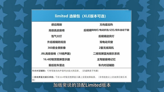 加版常说的顶配Limited版本,实际上就是在XLE型号的基础上,选装了一个Limited