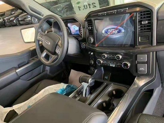 福特F150车内配备标准独特的皮革和布艺装饰的座椅,驾驶员侧的电动十向调节。这些座椅同时具备记忆功能。中控功能区域可分为三个小控制区,最上端为音响控制及导航控制,中间为收音机调节控制,最低端为空调及座椅加热控制。在内部空间的庞大基础上,福特也提供了非常具有舒适性与服务性的内饰配置。另外,新车还配备了一块大尺寸的全景天窗。