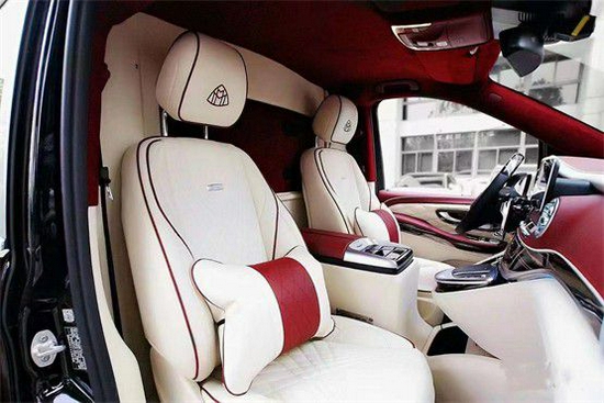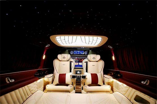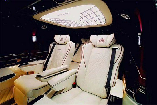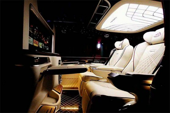 奔驰V260L改装7座缇香版全车内饰以咖色与棕色的真皮互相搭配,车顶用鹿绒皮包覆,皮质松软而顺滑。奔驰v260L经典迈巴赫九宫格灯饰,给全车带来充足的光线,再搭配周围亮色的氛围灯,使得格调分外高贵。