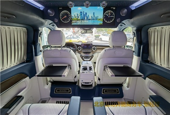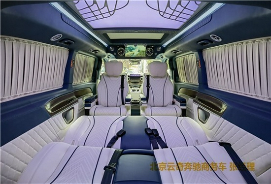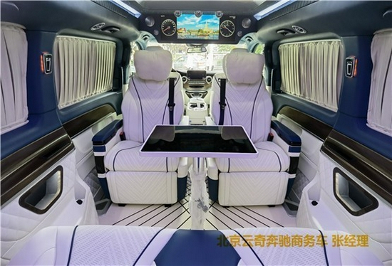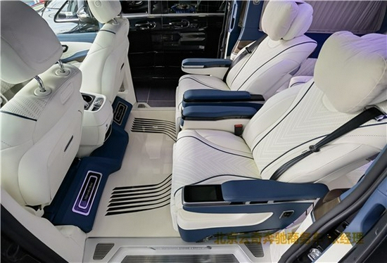 2021款奔驰V260L改装商务车第二排航空座椅为带电动、加热、按摩、通风功能的航空级首长席,可沿着地面上滑轨实现一键电动式前后滑动,对于这种智能化的乘坐体验,是原厂车型笨拙的手动拖拽模式所望尘莫及的。车内的氛围灯打开后,奔驰V260内舱变得灵活多变,气氛也可以根据主灯颜色变换而变化,主要的乘坐座椅配置的独立的按摩功能,通风加热,一体腿托,功能丰富,乘坐舒适,是商务接待用车的代步良品.