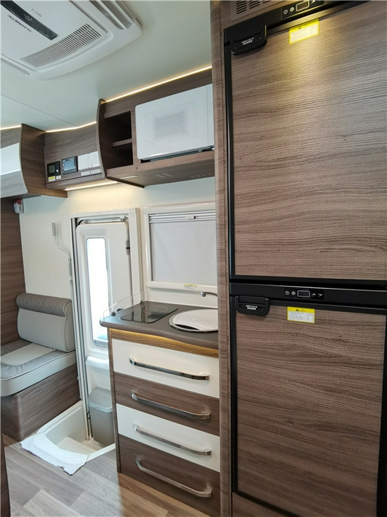 厨房区域功能齐备,厨房区配备电磁炉、盖板洗菜盆、冷热水龙头、低噪水泵一氧化碳报警器、可燃气体探测器等,上方及下方还配有储物空间便于存放日常食材,右侧是两台英德尔76L冰箱共计152L,满足冷冻冷藏的需求。