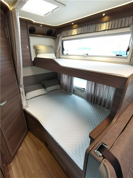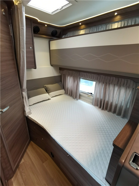 会客厅采用了L型环绕式座椅布局,且所有的座椅均采用双拼色高档皮革包裹和奔驰商务车缝线、褶皱工艺,提升了整车的质感。座椅采用高回弹海绵填充,支撑性和舒适性都是上佳的表现,保证了长途旅行的舒适性。也可以转换成一张尺寸为1.2×1.5(米)的儿童床。