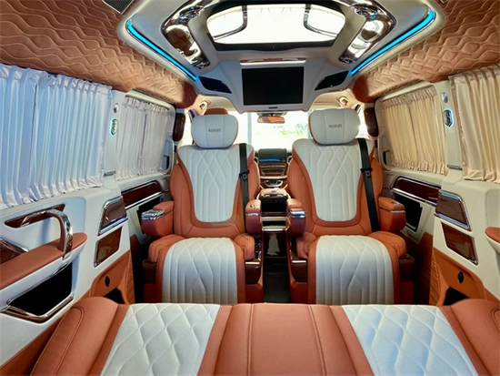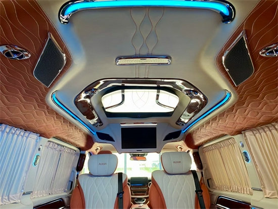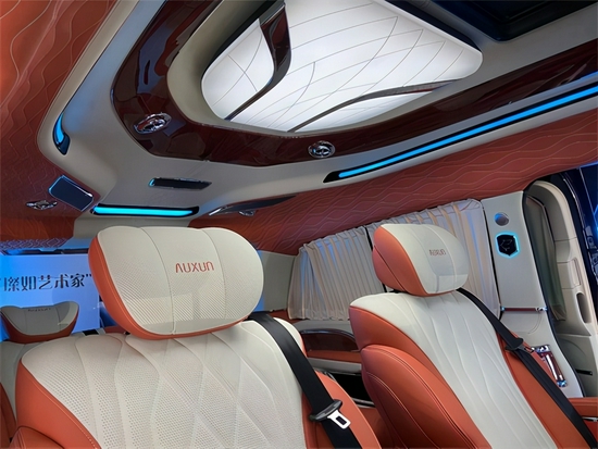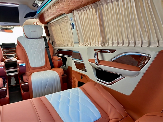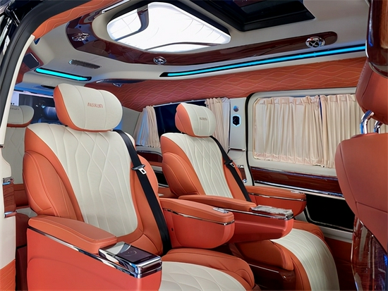 全车内部真皮包覆,真皮打造享受最极致的奢华。顶灯设计精致巧妙,与高档Alcantara麂皮绒包覆顶棚完美结合,相得益彰,置身其中享受富丽堂皇。细节设计巧妙细致,打造整体完美品质。内部高档定制实木地板,铺垫方寸之间的品味,搭配私密绒布窗帘,赋予内部绝对私密安全,享受真正奢华大气。
