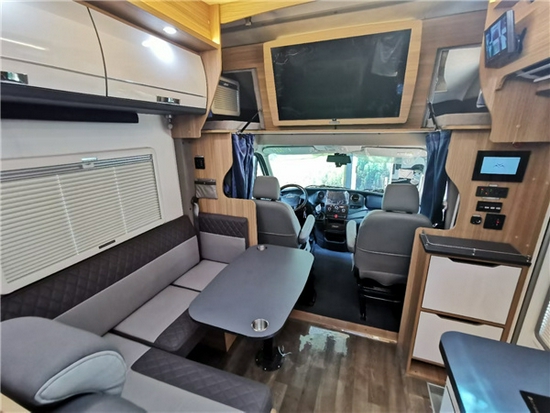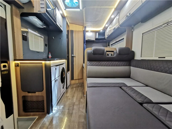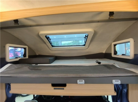 前额头配有天窗及双人床(2210*1500mm)。影音娱乐配有互联网智能电视(可选装投影幕布)搭配高品质音响,视听效果更加震撼。