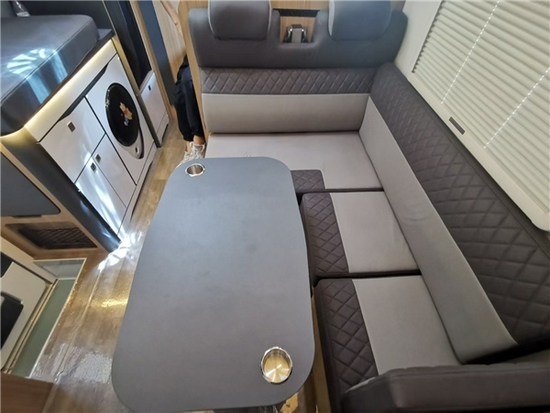 车内左侧的会客区采用L型卡座+可升降式餐桌的搭配,可供多人休闲娱乐使用,同时在驻车时可根据个人需求临时组合成床,内部睡眠空间进一步增加;会客区上方搭载多组储物吊柜,充分满足旅居生活时储存物品的需求。
