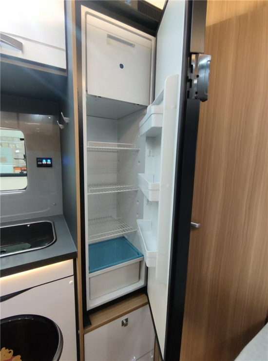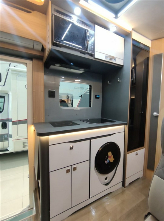 电力集控区放置在一进门右手,驾驶室后。带有插座和USB接口,极具科技感的图形化操控用起来也十分方便。此处能当作一个饮品台使用,下方还带有鞋柜。厨房区所见即为标配,一体式不锈钢带盖板水槽、可延伸厨房桌面,吸油烟机、三乔房车专用直流冰箱150L、微波炉、3kg小天鹅洗衣机、50L史密斯家用电热水器、富士通家用空调等等。基本上这款车标配的配置足以应付生活所需,厨房内抽屉和车外共用,空间利用灵活。