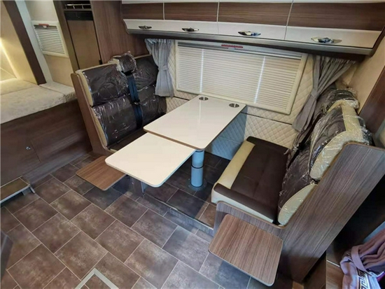 沿用了系列车型经典的双拓展横置床布局,超大空间的对坐式卡座沙发以及靠近额头床的组合式储物柜是其特点,双拓展的厢体结构也让这款隆翠自由风C房车在生活区空间上难寻敌手。新车选用轻量化环保板材及进口LG木地板纹地板革,家具整体风格清新明亮,尤其是灯光照明布置合理,车内非常明亮。舒适安全配置上,生活区有着行车冷风、燃油暖风、霍尼韦尔燃气泄露探测器及CO报警器。