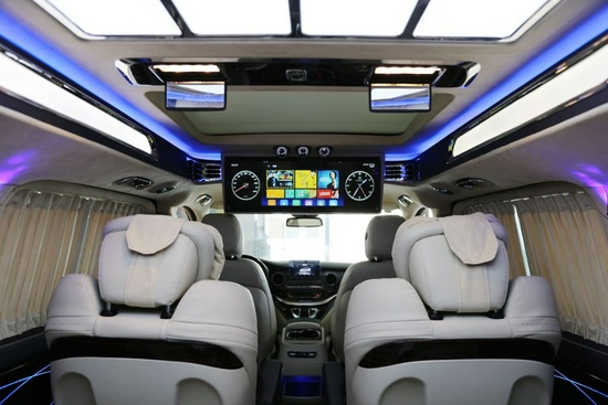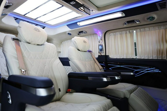 2021款全新奔驰威霆7座商务车改装后舱,立刻就会被它的豪华绚丽而征服,整车环保真皮包裹,游艇级柚木地板铺设,豪华感无处不在,全部采用真皮制作,豪华木饰装点,带有按摩加热通风功能,后舱前为两个独立航空座椅,第二排座椅安装进口首席航空座椅,加热通风按摩功能齐全,最大限度的减缓您的乘车疲惫,八向电动调节:电动头枕,电动腿托,前后电动调节,电动靠背调节,第三排为一组沙发座椅(可电动展平,形成一张舒适的沙发床)。