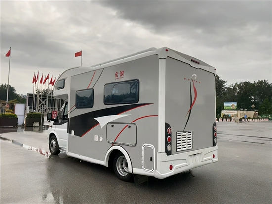 这是一款大额头C型房车,额头部分使用玻璃钢,车身部分选用复合保温铝板,如有需要,也可选装玻璃钢材质。车身外侧,配备有国产房车专用遮阳棚,在下方安装有LED灯带,夜间自带照明。下方靠近车门处是外置的抽拉式灶台和外置的淋浴喷头,并预留有5kg的燃气管舱,同时旁边的翻折式桌板,为野外烹饪提供了相当的便利,一些简单的烹饪都不用额外支起桌子。房车车门选用专用的乘客门,带纱帘,下方配备有电动踏步。