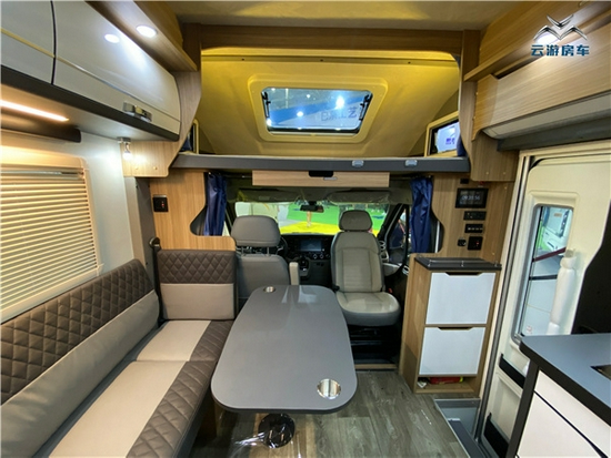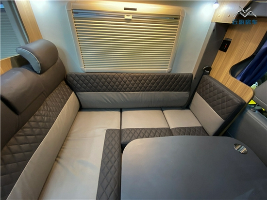 驾驶区与后方通舱式设计方便进出;后方便是会客区的位置,驻车时副驾驶旋转后可组成容纳更多人的会客区域;会客区的座椅采用L型沙发布艺座椅,并配有可升降式餐桌方便日常使用,餐桌上方设有杯托防止杯子在行车时跌落;