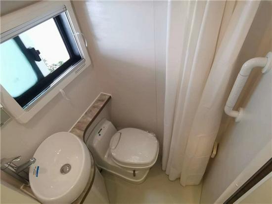 厨房位于中门后方,提供了电磁炉、洗菜池、储物抽屉、英得尔房车专用冰箱等基础设备,车内简单烧水熬粥没问题,煎炒烹炸的话建议还是使用车外的燃气灶。卫生间部分比较常规,内部配备赛特福德可旋转式坐便器、洗手池,换气扇及淋浴花洒等。水路系统方面,净水箱容积为180升、灰水箱容积为45升(灰水箱带有手动和自动排水双排水系统),黑水箱容积为18升。
