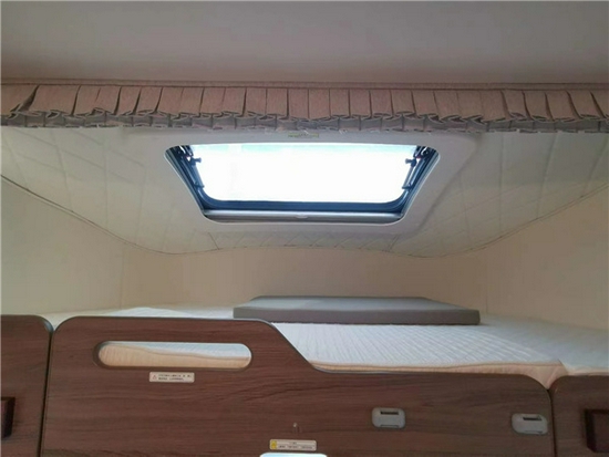 家具采用进口轻质环保板材+高级皮料装饰,整体空间温馨雅致。额头床下方是一台32寸高清液晶电视,与之匹配的音响系统有双音区播放器、航海级超薄喇叭、4G路由器。