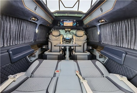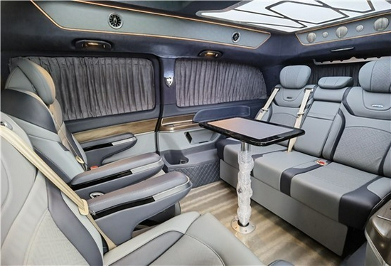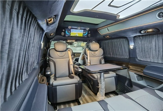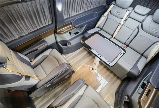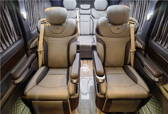 2021款奔驰V260L改装商务车第二排航空座椅为带电动、加热、按摩、通风功能的航空级首长席,可沿着地面上滑轨实现一键电动式前后滑动,对于这种智能化的乘坐体验,是原厂车型笨拙的手动拖拽模式所望尘莫及的。车内的氛围灯打开后,奔驰V260内舱变得灵活多变,气氛也可以根据主灯颜色变换而变化,主要的乘坐座椅配置的独立的按摩功能,通风加热,一体腿托,功能丰富,乘坐舒适,是商务接待用车的代步良品.