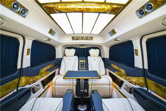 两边的雾灯区域,有五条电镀筋线,非常亮眼,最底部有一条连贯式的镀铬条,象征着一路劈荆斩棘、勇往直前。奔驰V260L改装平顶七座圣母峰版商务车在格栅的下方包围有着九条阶梯式的亮条,具有层层递进,步步高升的寓意,所以这前脸的整体设计象征的的是九五之尊。
