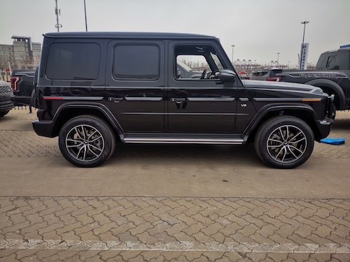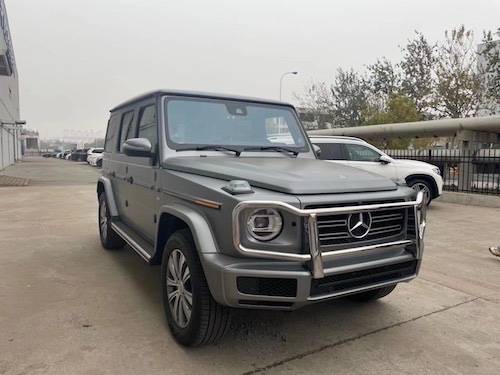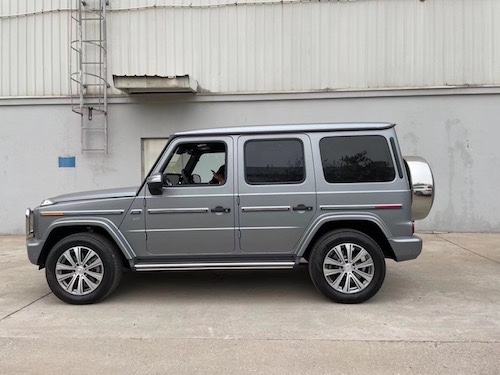 2021款奔驰G (配置|询价)550基本参数: 4.0升421匹马力、V8双涡轮增压、7速变速箱。 离地距离 450mm涉水能力 1米、轮胎间距 1.744mm、3种驱动模式、22寸轮毂、每个轮胎带有两个减震器及两个悬架弹簧 4500*2041*2235 轴距 2850。侧面看上去就显出超高的悬挂,轮眉和轮胎之间间隙很大。