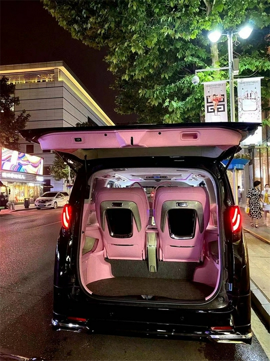尺寸4975*1850*1890mm,轴距3米;所以所谓的定制版就是在外观和内饰做了更有视觉感的设计。双侧依旧是电动门,电动门玻璃支持升降;尾部处是方方正正的设计,阶梯式的尾灯别有一番感觉,而它的排气方面采用了隐藏式设计。