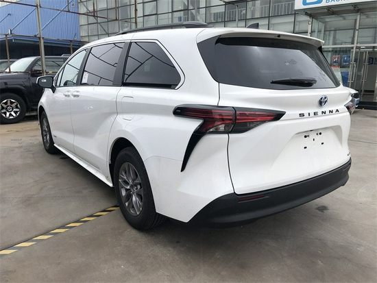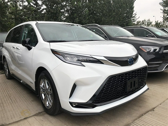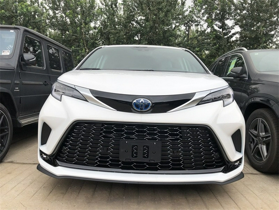 新款21款油混塞纳和老款3.5L汽油塞纳前脸一样,都是一个标志性的很夸张的横条进气格栅,就像一个大嘴巴一样。不同的地方在于,丰田标改成了油混版的蓝底,丰田标两侧的小格栅改成了黑色实心装饰。