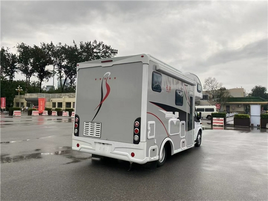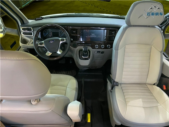 驾驶区与后方通舱式设计方便进出;后方便是会客区的位置,驻车时副驾驶旋转后可组成容纳更多人的会客区域;会客区的座椅采用L型沙发布艺座椅,并配有可升降式餐桌方便日常使用,餐桌上方设有杯托防止杯子在行车时跌落;
