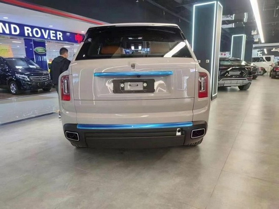 库里南车尾造型同样延续了劳斯莱斯方正的家族式特征,粗壮的D柱在车尾形成了陡峭的倾斜。平直的后风挡自车顶的扰流板向下延伸,在尾部形成了一个平台。整体造型依旧充满力量感。尾灯造型相比全新幻影更加方正,环状的LED灯带内部镶嵌着带有双R标志的装饰,更显精致。