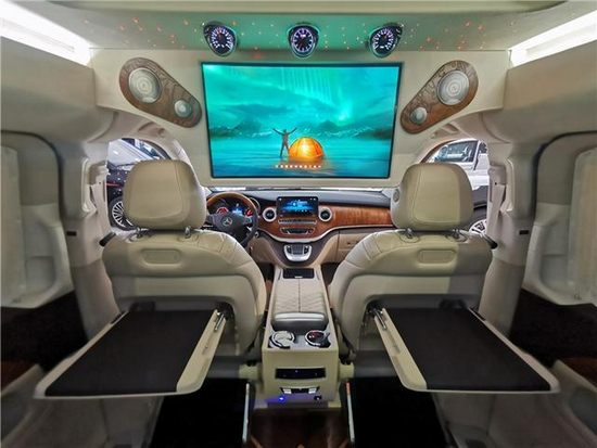 奔驰V260L高顶上半隔断改装商务车是在奔驰V260L裸车基础上进行改装,操控台依然采用了C级 (配置|询价)操控台,怀档,9速手自一体,主副驾驶以及侧门进行软包,进行隔音处理,以降低车内噪音,主副驾驶冰箱换成超大25升恒温加热或制冷恒温功能。