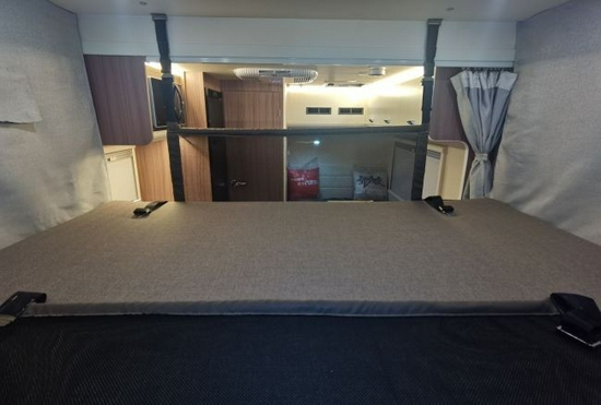 国六依维柯欧盛自动挡T型小额头房车的设计虽然取消了额头床的设计,但它在环形卡座的上方设置了可升降式双人床,床体两侧配备了防护网,让我们在睡觉时更安心,不用担心滚落摔伤。