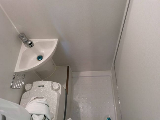 21款上汽大通V90B型房车厨房区域边上就是独立卫生间,卫生间内部装有花洒式冷热水龙头、毛巾架、镜子、洗手盆、肥皂盒,另外还带有便携式马桶。