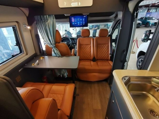 21款上汽大通V90B型房车正副驾驶座椅带有旋转和加热功能,同后排的单排座椅与升降桌组成了整车的会客区,得益于高顶的设计,车内空间完全没有B型车内部紧凑的感觉,必要时,可以将座椅和桌板放平拼成一张床铺供人休息。